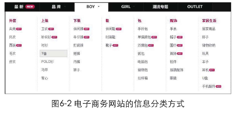 比如,在生活中,要买一件男士T恤,会首先找到商场卖男装的楼层,再找到店铺中摆放上衣的区域去挑选恤。在电子商务网站对商品进行组织时,同样采用了这种“男装>上装>T恤"的分类方式,如图6-2所示。如果分类方式改成"上装>男装>T恤",你会不会觉得怪怪的呢?不符合逻辑习惯的分类很容易把用户弄糊涂。