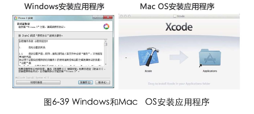 想想安装应用程序时Windows系统是怎么做的?让你去阅读安装许可协议,选择安装在哪个盘中,不停地点击下步,还有很多高级选项让你去琢磨和修改。而在MacOS系统下,用户仅需要简单地拖拽,将应用图标拖到Application文件夹中即可完成应用程序的安装。也许没用过MacIOS的朋友永远都不会觉得在Windows中安装软件是件很麻烦的事,因为已经习以为常了。但一旦用过这种简单直接的安装方式,便会由衷喜欢上它,如图6-39所示。