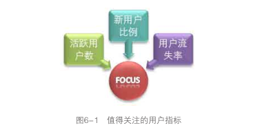 从上面可以看出,我们在获得访问用户数、新用户数、活跃用户数、流失用户数、回访用户数的同时,通过计算还得到了老用户数、留存用户数等衍生用户指标,同时得到了新用户比例、活跃用户比例、用户流失率、用户访问率等复合指标。这些指标给我们的分析提供了足够的支持,而且指标的定义相对明确,有各自的应用价值,不会存在相互重复或重叠的部分,类似这样的网站用户指标体系是比较完整和规范的。至于上面提到的其他用户指标,也许在某些时候基于某些分析才会用到,一般不需要作为 日常指标,可以使用临时统计或者从其他数据中间接获取。 当我们已经定义了一套适合分析用户的指标体系之后,可以看一下哪些指标值得重点去关注,这个时候可以设想一下 : 如果你想用尽量简洁有效的数据了解一个网站或产品的用户情况, 你会问哪几个用户数据? 如果是我提问,我只会问三个指标:活跃用户数、新用户比例和用户流失率,如图6-1所示。