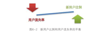 新用户比例反映着网站或产品的推广能力,渠道的铺设以及带来的效果,新用户比例不仅是评估市场部门绩效的一个关键指标,同时也是反映网站和产品发展状况的重要指标。然而,只看新用户比例是不够的,需要结合着用户流失率一起看,我见过流失率98%的网站,也见过流失率20%左右的产品,流失率会根据产品对用户黏性的不同而显得参差不齐。用户流失率反映了网站或者产品保留用户的能力,即新用户比例反映的是用户“进来 ”的情况,用户流失率反映的是用户“离开"的情况,结合这两个指标会有下面三类情况,代表了三种不同的产品发展阶段,如图6-2所示。