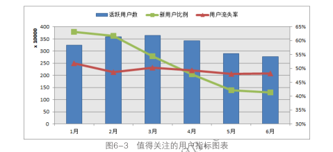网站的活跃用户数体现了网站制作当前实际掌握的用户数量,结合新用户比例和用户流失率可以分析网站用户的发展情况,通过这三个指标基本可以掌控网站用户的全景。可以将这三个指标放在一张图表中来分析网站用户的状况,如图6-3所示。