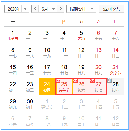 放假时间:2020年6月25日(周四)——2020年6月27日(周六),共三天。